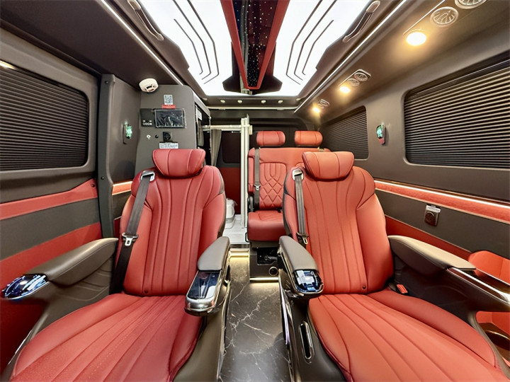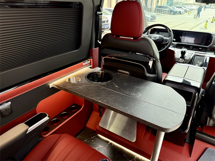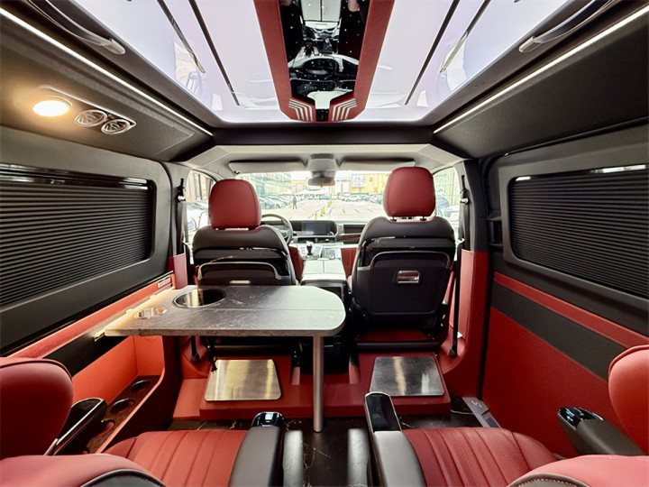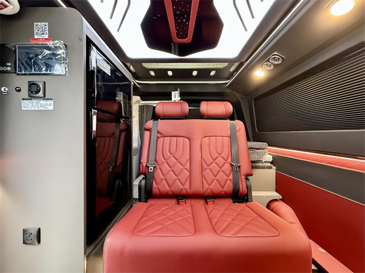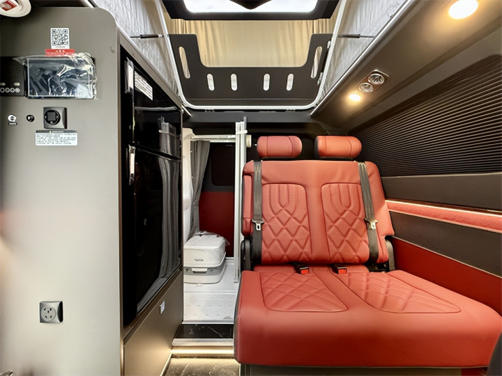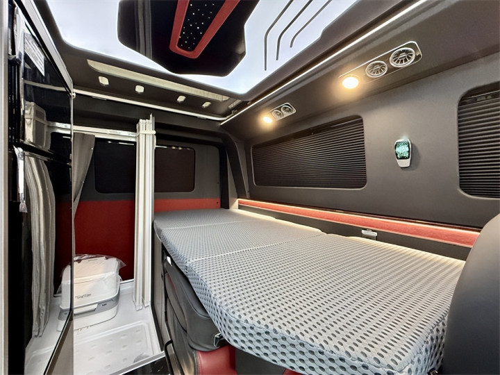 空间设计是其核心亮点,5341*2040*2150mm的外形尺寸与3300mm轴距,在合规范围内实现空间利用率最大化。额定6人载客量满足商务接待与家庭出行双重需求,主副驾驶座椅采用优质包覆材质,配备通风加热按摩功能的高档航空座椅可六向调节,二排乘用车级双人座椅支持前后与侧向移动,让每一位乘客都能找到舒适坐姿。休息场景同样从容,升顶双人大床(18501160mm)与尾部拼床(1850870mm)灵活切换,配合REV定制开放式保温升顶帐篷与RTM三层复合高强度升顶机构,在有限空间内拓展出充足休憩区域,抬头即是1.1*0.8米车顶大尺度天幕,夜晚可静观星空,晨起能沐浴晨光。